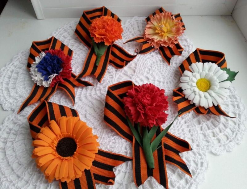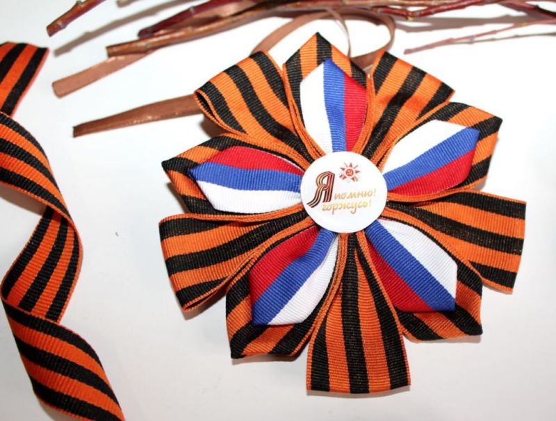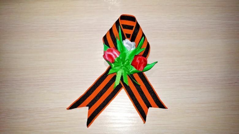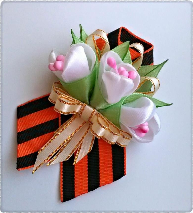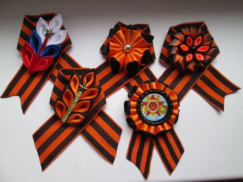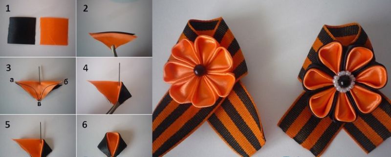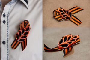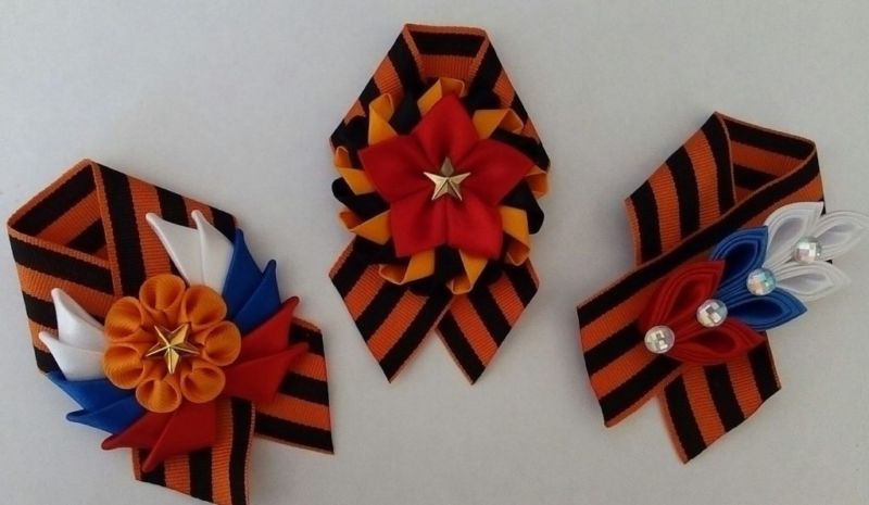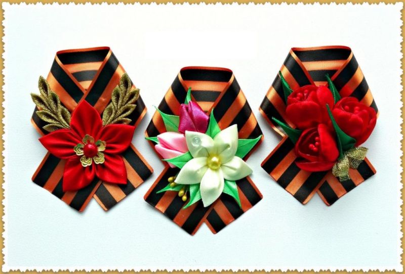 Лентата на Свети Георги е сгъната на панделка. Получената композиция се залепва в центъра му. От грешната страна прикрепете щифт. Трикольор в техниката на kanzashi готов.