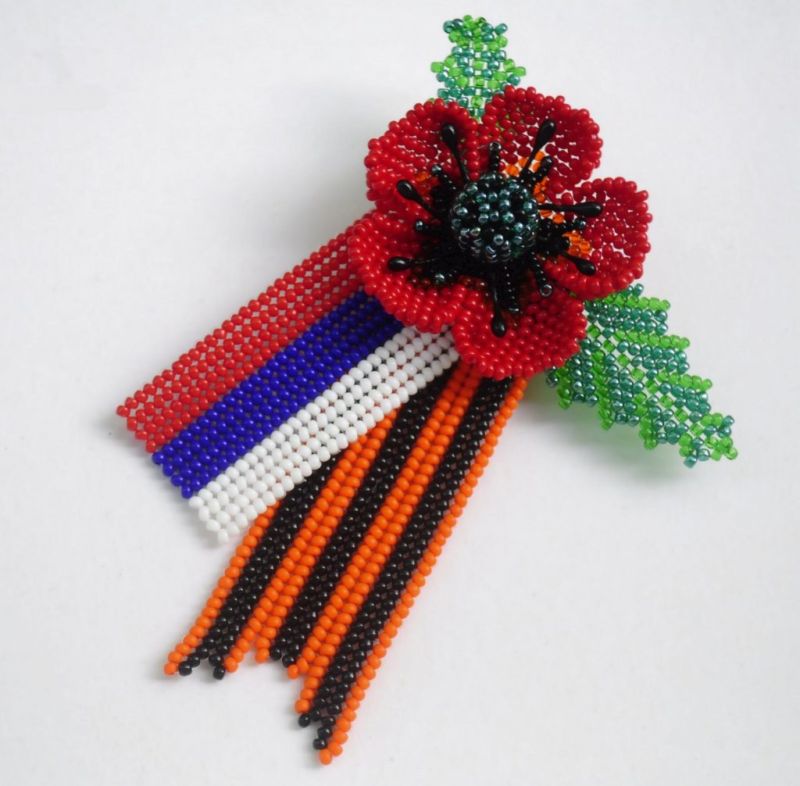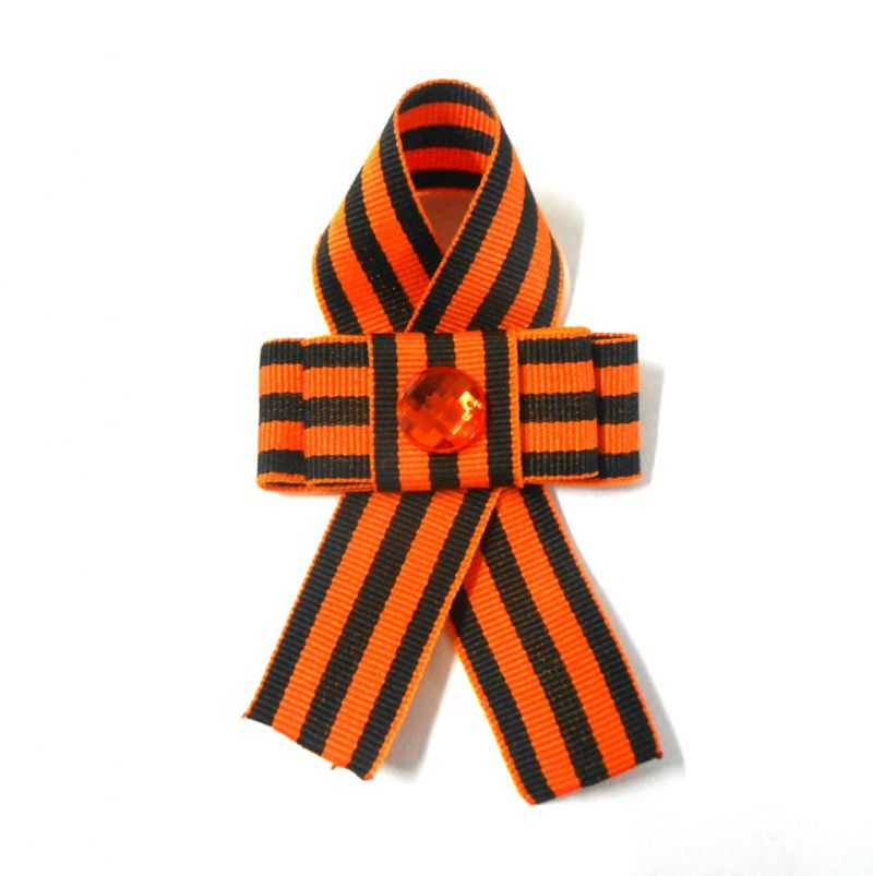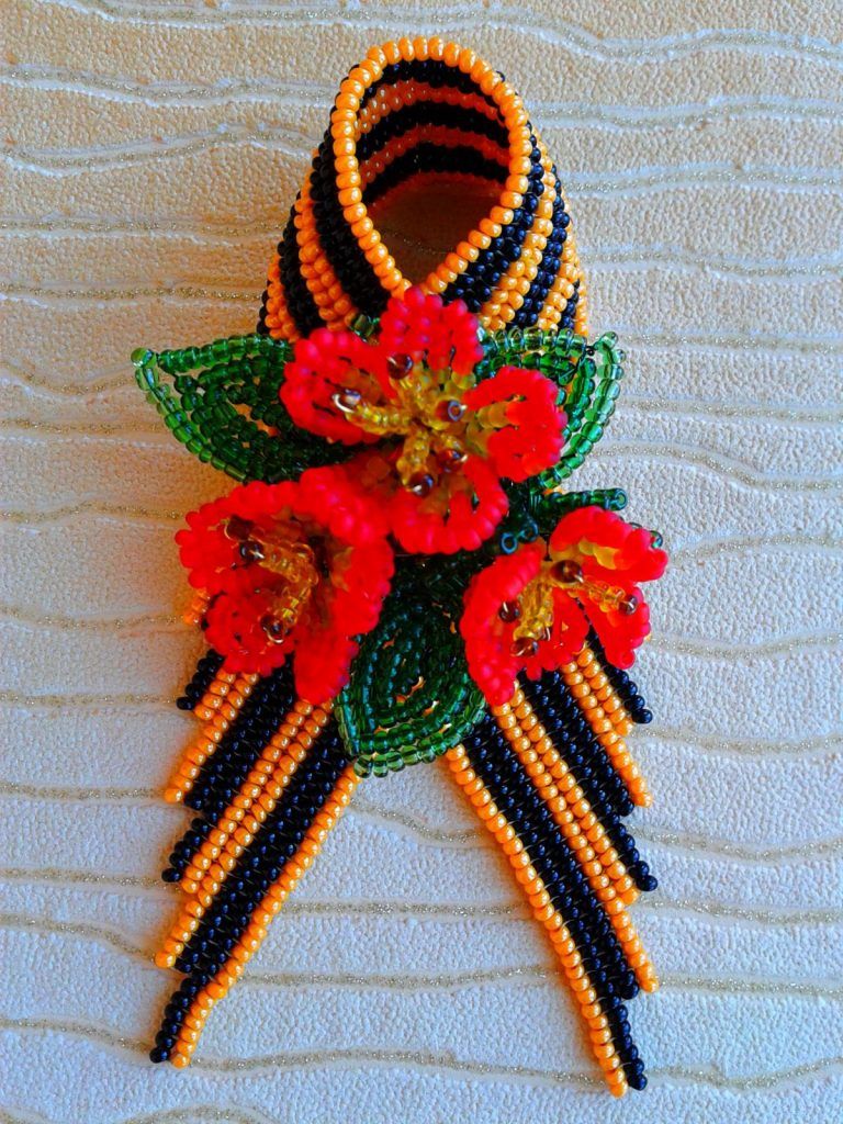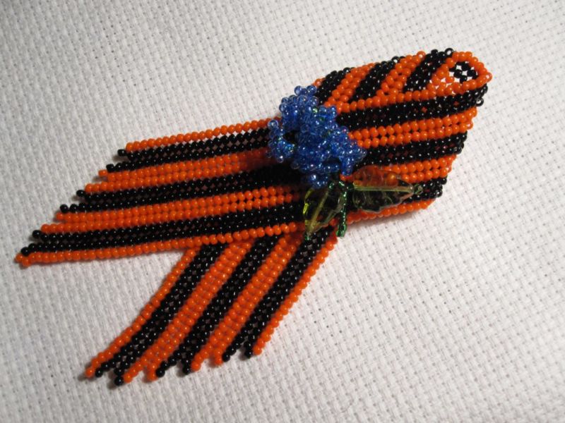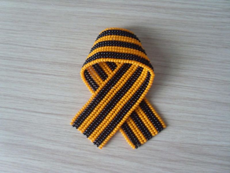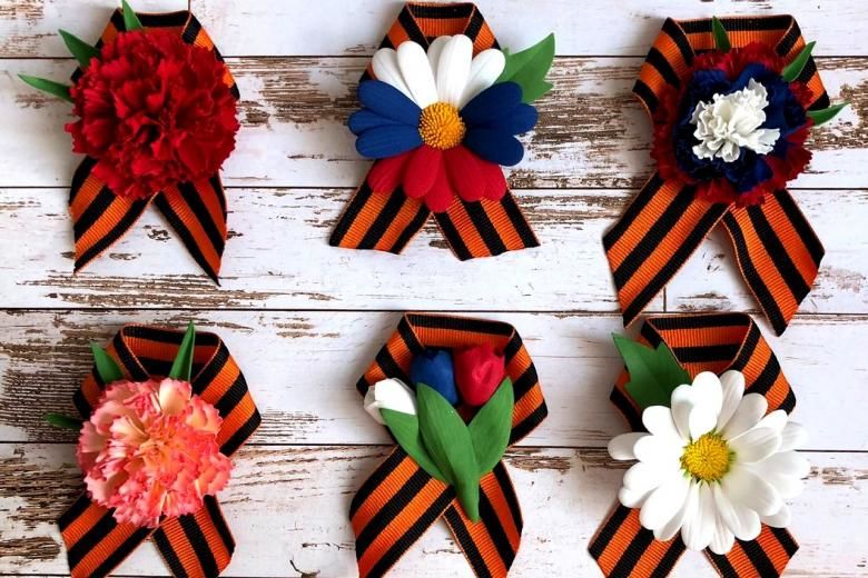 Лентата на Свети Георги е сгъната на панделка. Получената композиция се залепва в центъра му. От грешната страна прикрепете щифт. Трикольор в техниката на kanzashi готов.