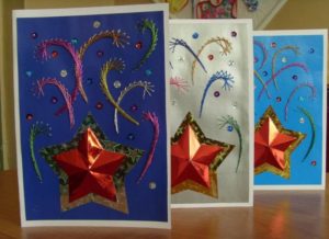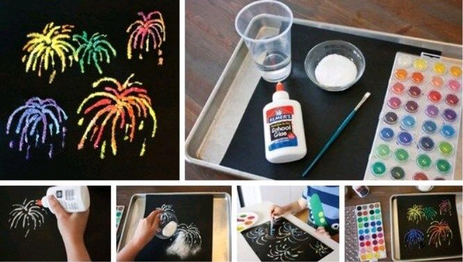 Първо, на лист цветна черна или синя хартия направете скици с молив на местата, където ще бъдат разположени фойерверките. След това тези участъци се намазват с лепило и върху тях се разпръскват парченца конец. Резултатът е такъв мъхест и пухкав ярък фойерверк. Отдолу може да се нарисува силует на къща.