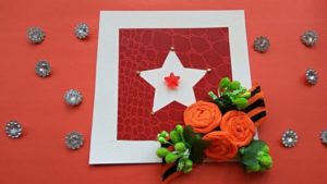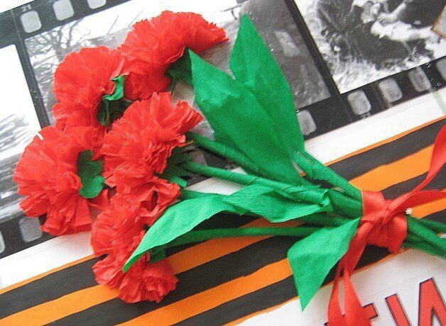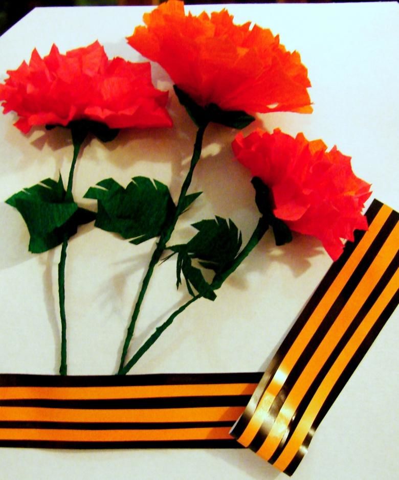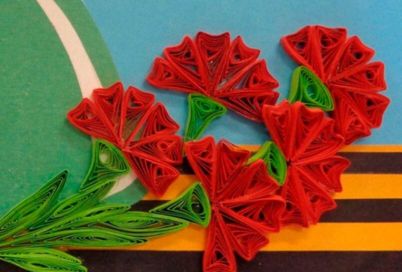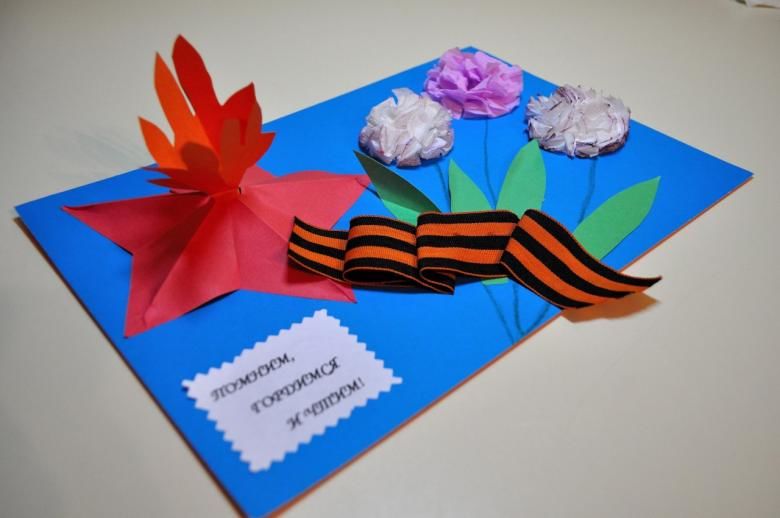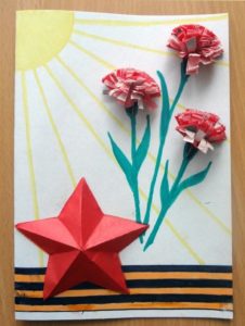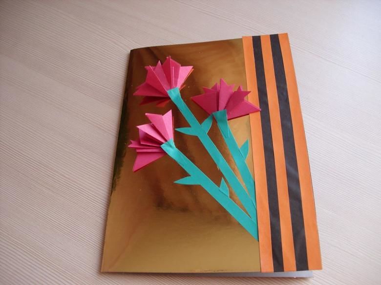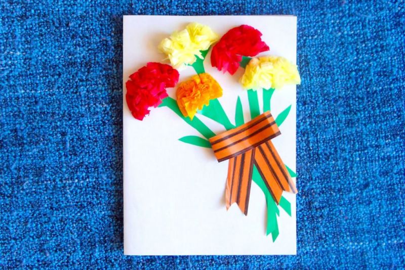 Георгиевска лента може да се постави на лицевата страна на картичката заедно с карамфили. Необходими са ви цветна хартия, моливи и панделка: