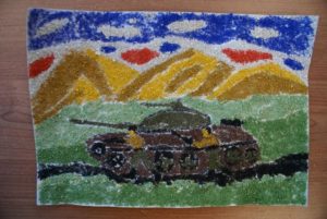 - върху лепилната основа се поръсва грис в различни цветове.
