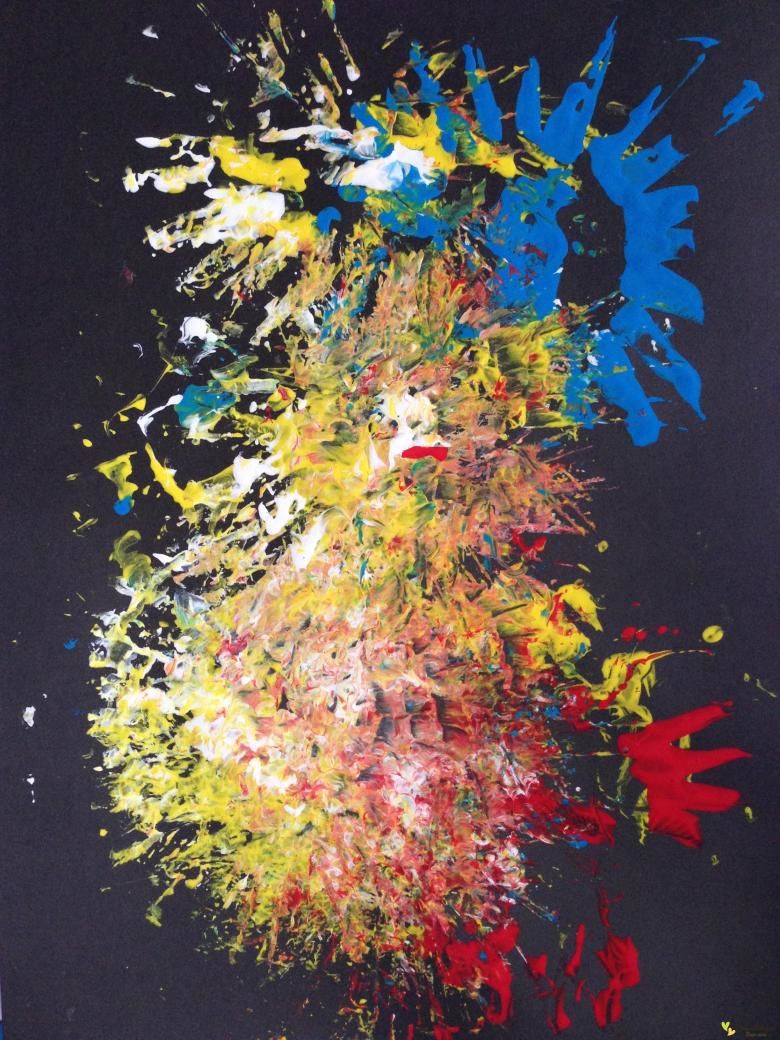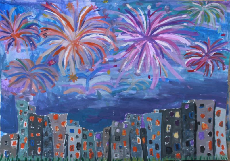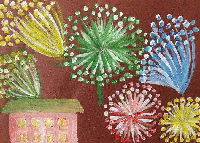 Най-добре е фойерверките да се рисуват в два основни цвята, а останалите - в нюанси. Фонът може да е син или друг подходящ. Основното е да прилича на нощното небе.