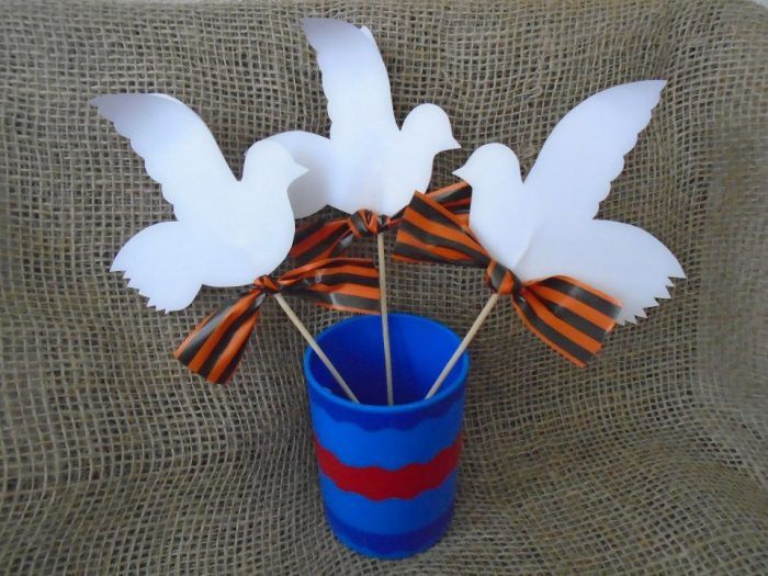 Оригиналните занаяти с гълъби и цветя могат да украсят всяка изложба. Той ще зарадва ветераните и възрастните хора. Създаването на такъв дизайн няма да е трудно дори за хора, които са далеч от творчеството. Изпълнение на работата стъпка по стъпка: