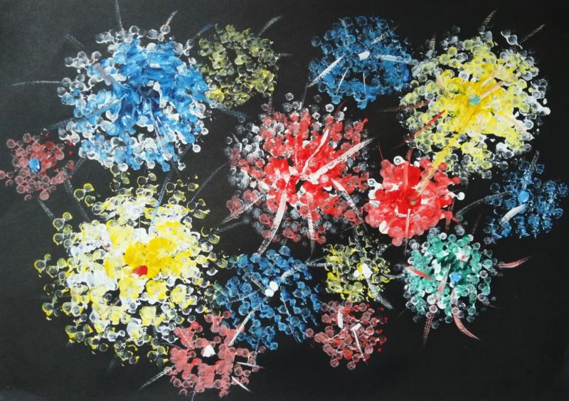- след това размажете с пръст пластилина в различни посоки около кръга, за да се получи подобие на фойерверки (ако пластилинът не е достатъчен, можете да добавите още);