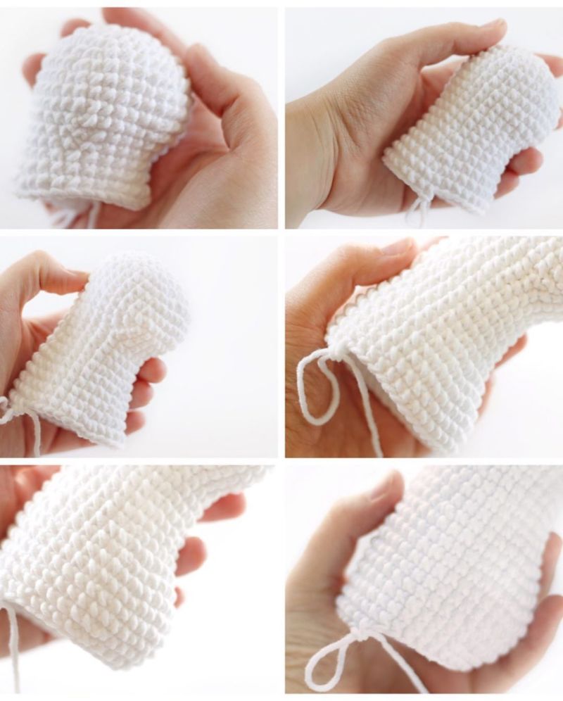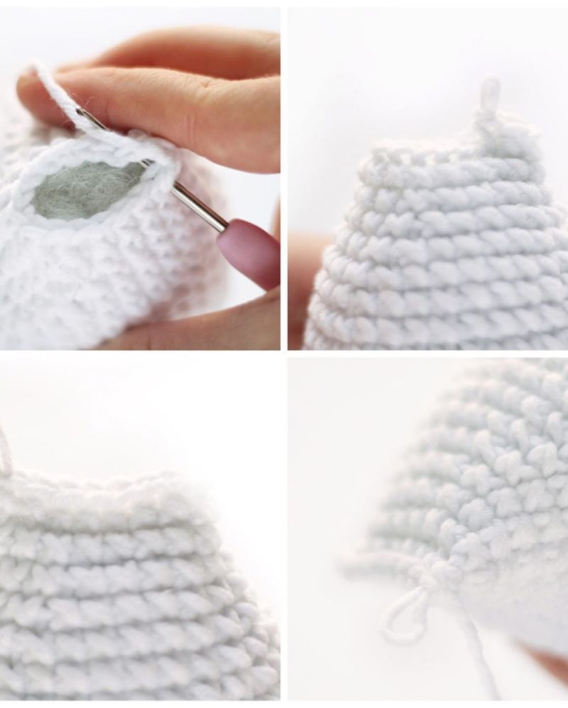 След това напълнете пълнителя за главата и гърдите. Продължавайте да плетете и да ваете, докато дупката изчезне. След това отрежете преждата и я затегнете.