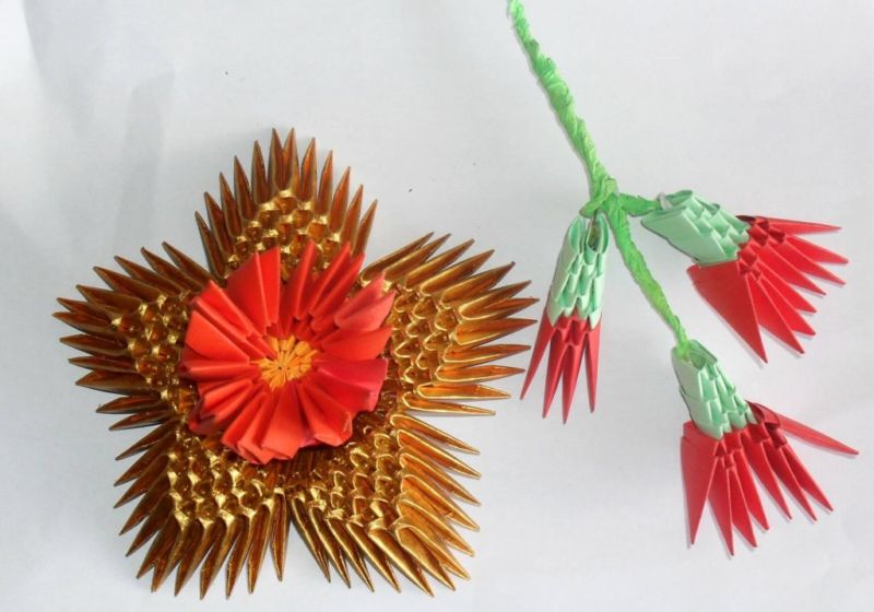 - направете пет лалета според схемата на оригами, стъбла от зелена хартия;