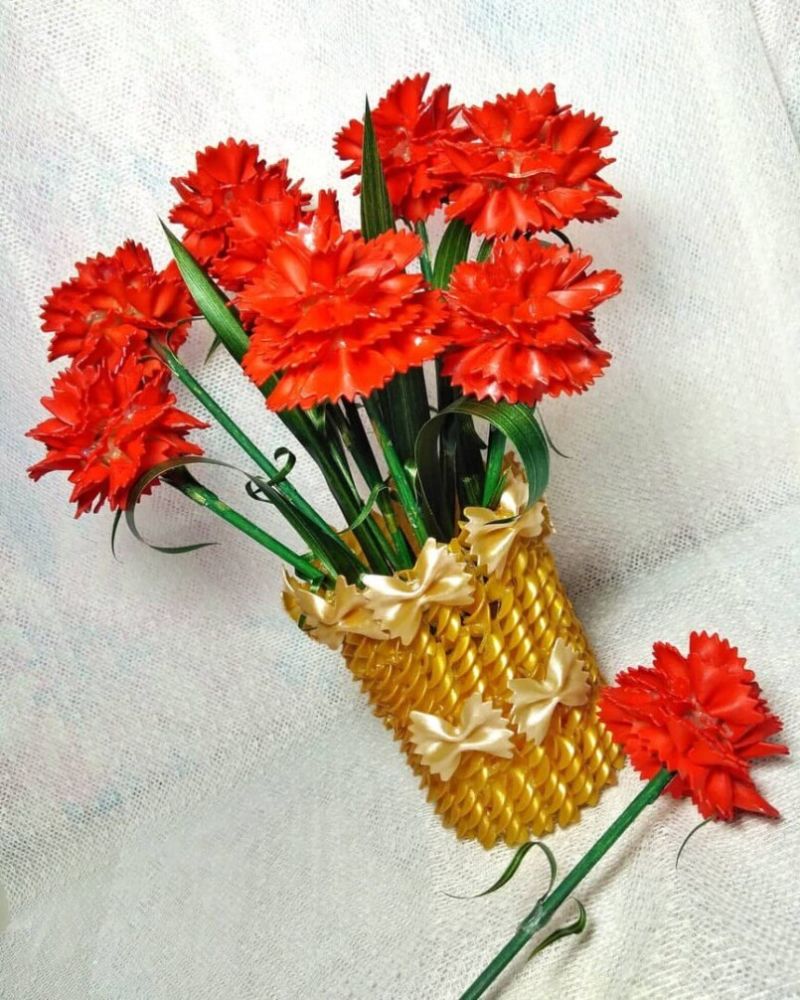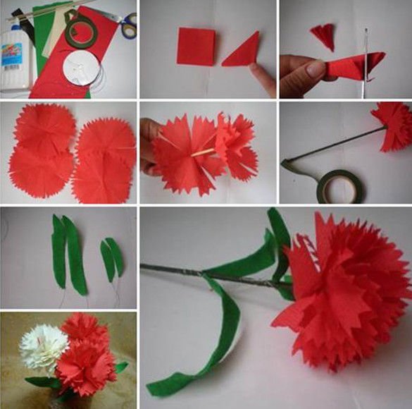 - Изрежете кръгове върху няколко слоя червена велпапе, сложете ги един до друг и ги скрепете с телбод. Кръгчетата се нарязват на тънки ленти и се мачкат, като върховете им се повдигат леко. Цветята се прикрепят към основата с лепило. Листата и стъблата са изрязани от зелена хартия.