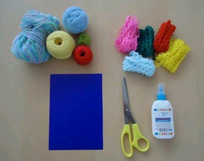 От конците могат да се правят фойерверки. Вземете ги в различни цветове и ги нарежете на малки парчета. Изберете прежда, така че моделът да е текстуриран и интересен.