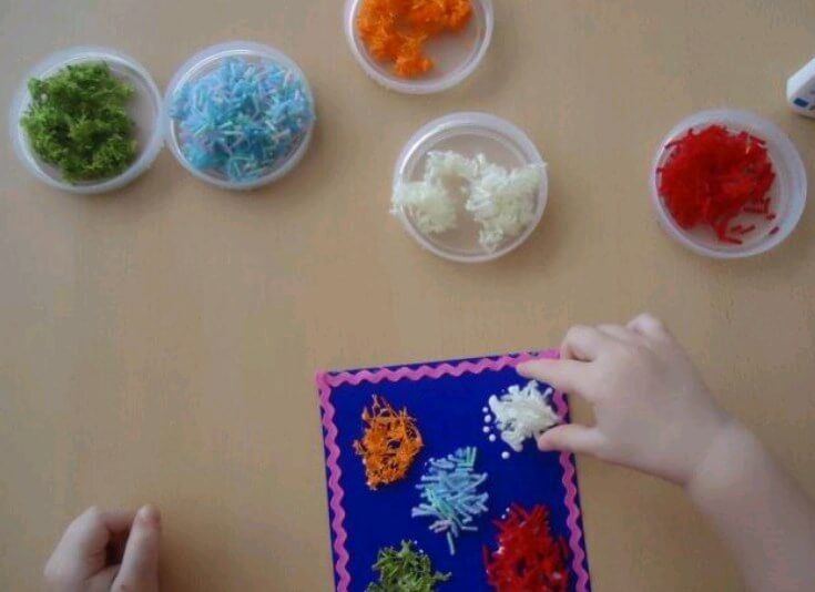 Преди да започнете работа, е необходимо да се подготвите: да боядисате грис, защото салът се състои от различни ярки цветове: