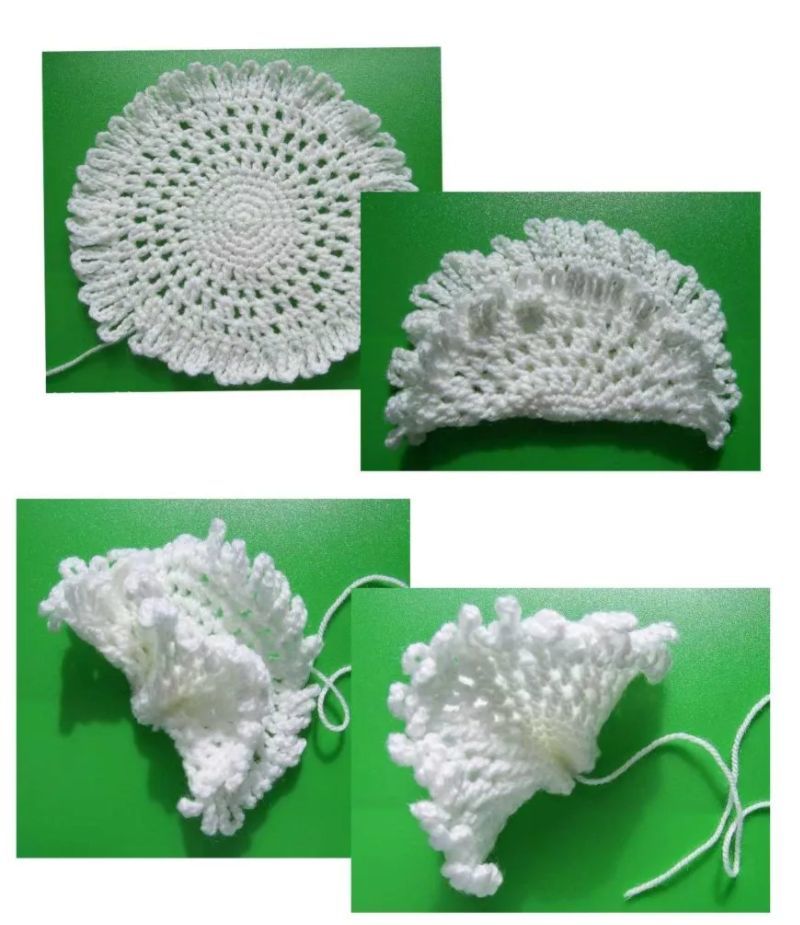 Получава се красива кръгла салфетка. След това се сгъва, така че едната половина на кръга да е по-ниска от другата, и се зашива на гърба.