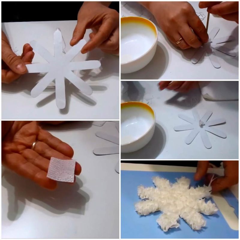 - След това ги разстелете на масата под формата на снежинка и започнете да лепите.