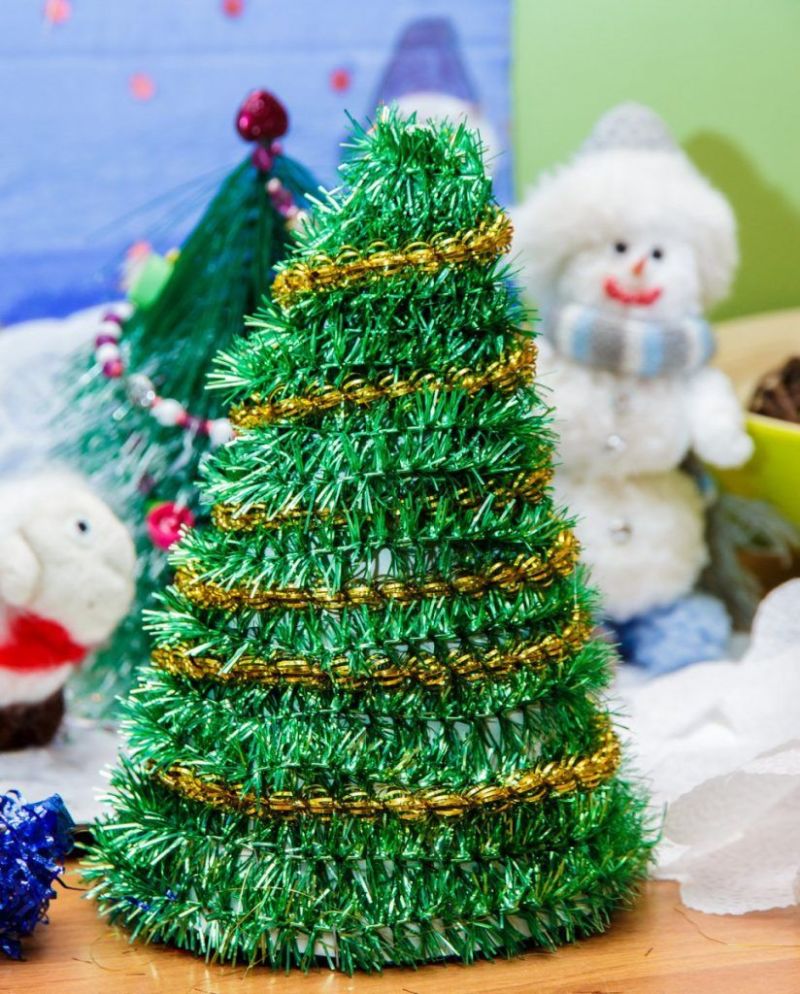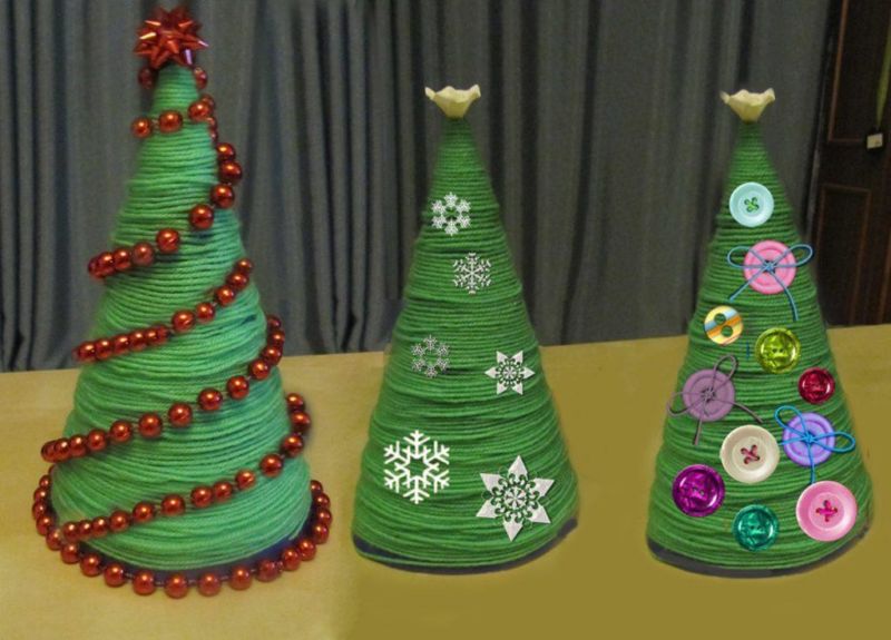 Последната стъпка е да боядисате дървото в зелено, да го украсите с мъниста или просто да го поръсите с брокат.