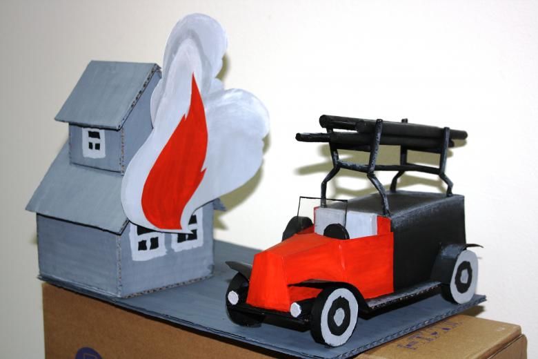 - Върху картона се поставя рисунка. Това е пожарна кола, която отива да гаси пожар.
