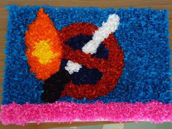 - На картона е нарисуван кръг с рамка вътре. След това върху него се поставя голяма кибритена клечка, която в единия си край имитира огнен пламък.