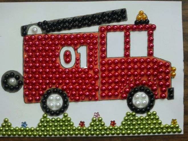 - В отделни съдове смесете зърната с червено, черно, сиво, зелено, розово и синьо. Трябва да направите пожарен автомобил, който да отиде на повикване.