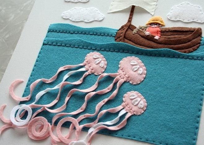 Първо изрежете произволни продълговати парчета и ги прикрепете към картонената основа. След това парчетата се зашиват с шевна машина или на ръка върху парче плат. Когато всичко е ушито, залепете го върху картонена основа. Ето го и морето от вълни от плат.