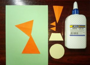 - Залепете всичко с лепило за хартия. Размажете лепилото с четка, за да избегнете неравности по апликацията. Детето ще се заинтересува от тази работа, защото ще види как цяла картина оживява с помощта на обикновени парчета хартия.