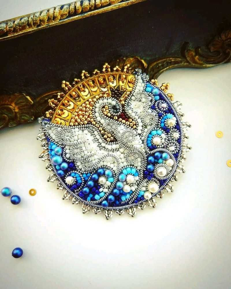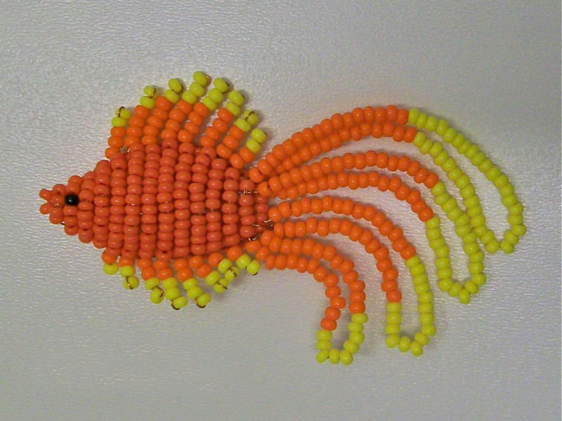 - След това с помощта на оранжеви мъниста очертайте основното тяло на рибата, а опашката може да бъде изобразена с жълти мъниста, като върхът на опашката се подчертае със злато.