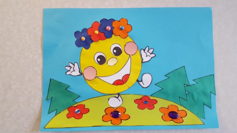 - Изрежете самия колобок с кръг от жълта хартия и създайте заобикалящите го обекти - дърво или елха, зелен фон, който да представлява тревата и къщата, от която е избягал колобокът.