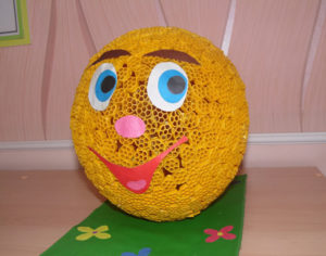 - След това завършете залепването на формата на топката. Можете да залепите очите, носа и устата, изрязани от цветна хартия, към готовия гобок.