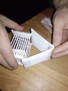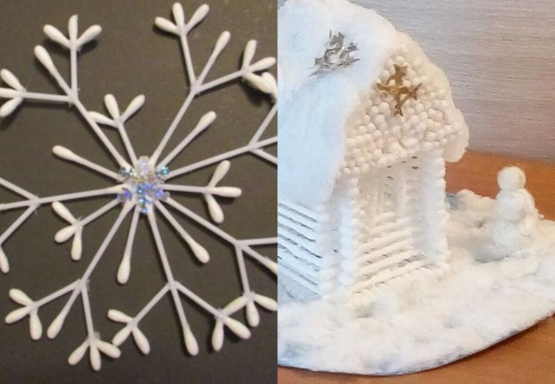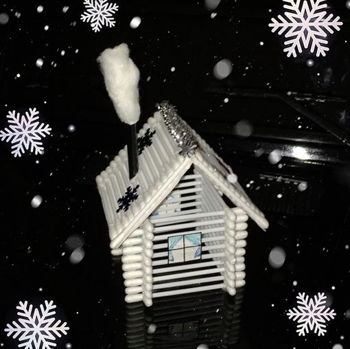 - Залепете памучните пръчици плътно една до друга върху тях. Красивата снежнобяла къща е готова!