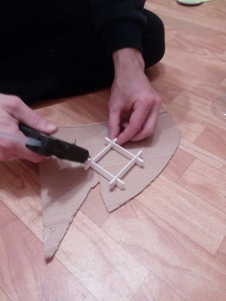 - След това пръчките се поставят отгоре, перпендикулярно на първите пръчки. Лепилото ще ги свърже, така че да се оформи цялата къща.