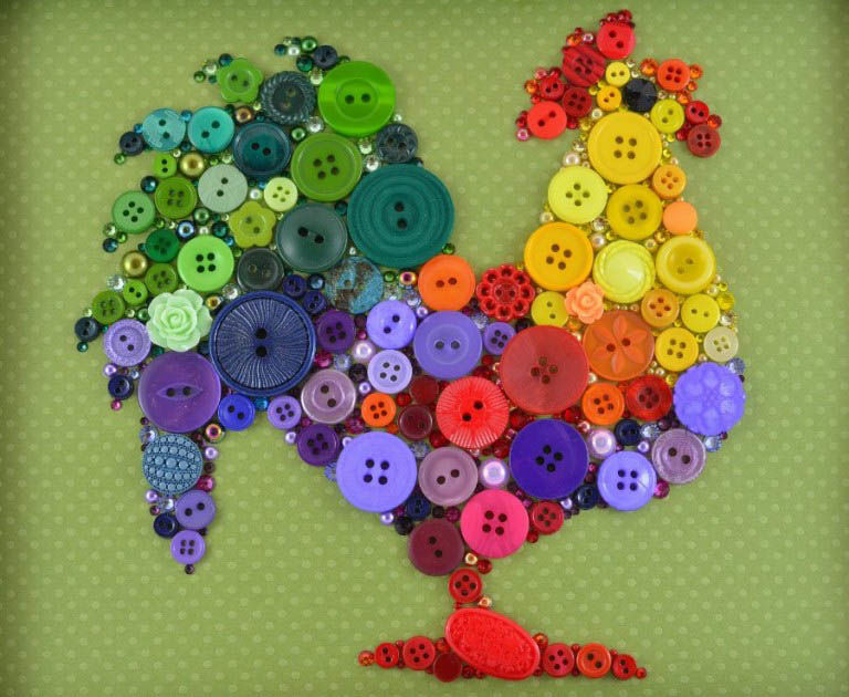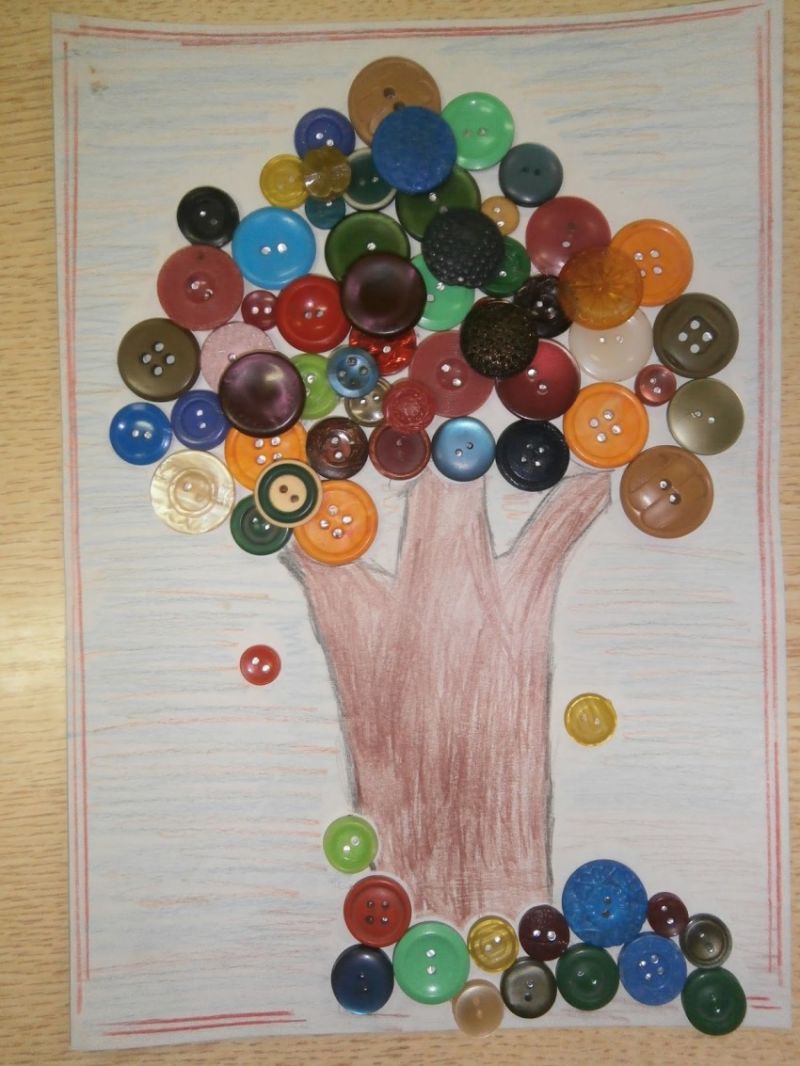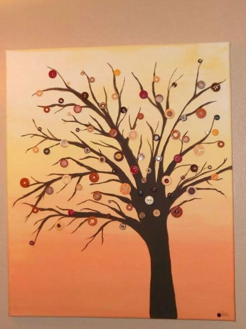 След това копчетата се залепват равномерно в зависимост от сезоните на фона. Получава се много ярка и необичайна картина, отразяваща смяната на сезоните.