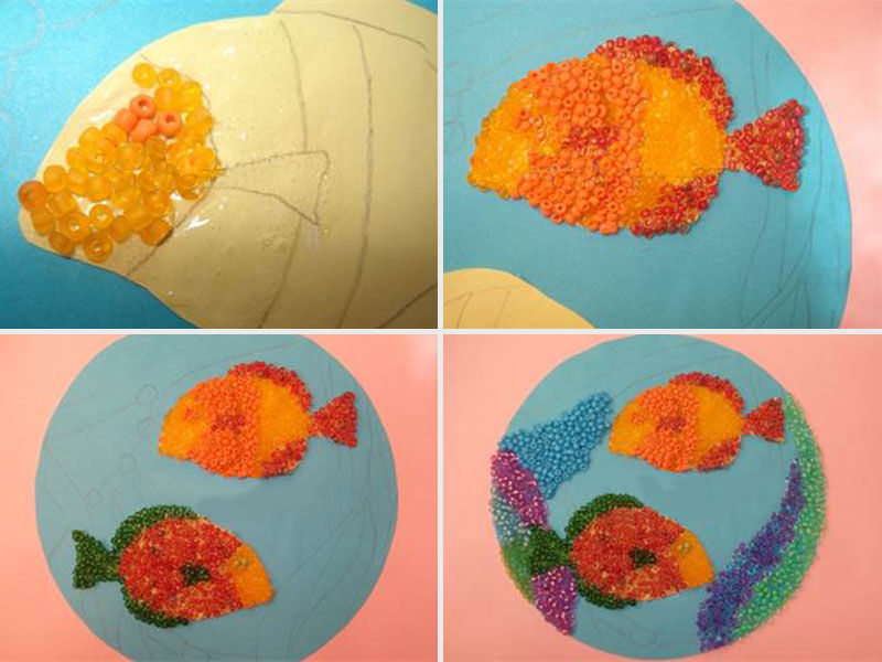 Ако владеете умението за плетене на мъниста, можете да го изплетете, но при децата е по-добре да използвате по-прост вариант, като направите занаят чрез залепване върху равна повърхност. За целта ще ви трябват: синьо или синьо картонче, жълти, оранжеви и златни мъниста, PVA лепило: