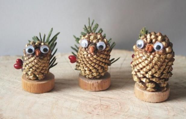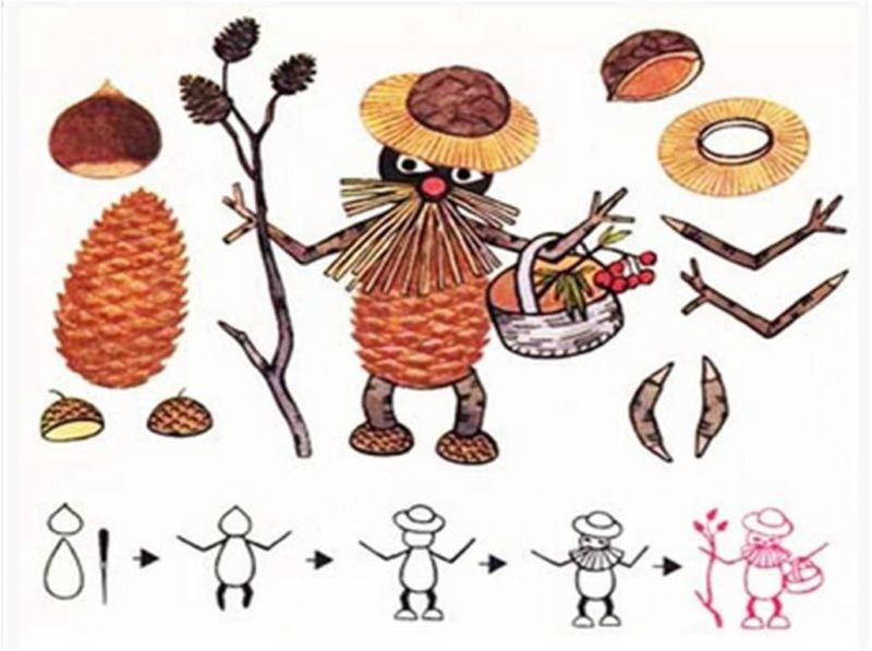 Обемните композиции и приложения могат да бъдат направени от естествени компоненти: изсушени листа, шишарки, трева. От шишарка и изсушени клонки може да се направи стар дървар: