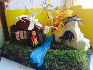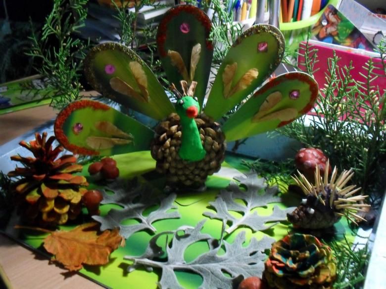 Сухите листа и клонки могат да продължат композицията и да създадат заобикалящата я гора. Такава занаятчийска работа може да бъде взета на конкурса в детската градина, посветен на приказките, тя ще зарадва децата и учителите.
