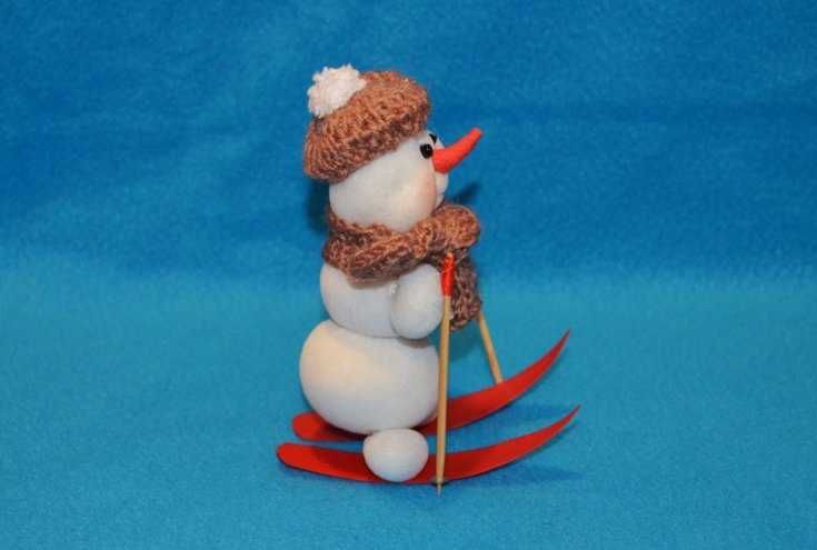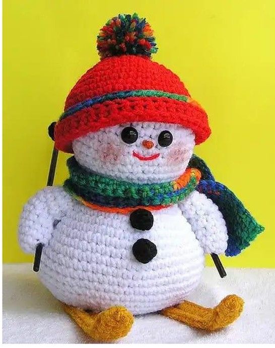 - За декорацията изплетете: шапка, четири топки (ръце, крака), ски, пръчки, нос от моркови, очи и копчета. Всичко се зашива заедно и се получава композиция за зимни спортове.