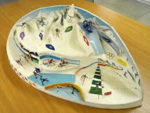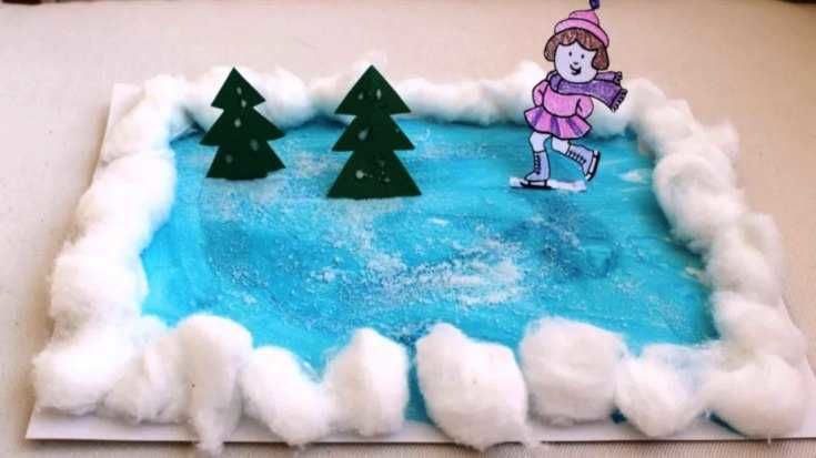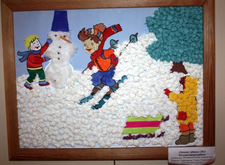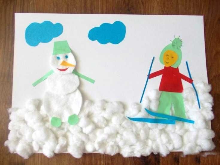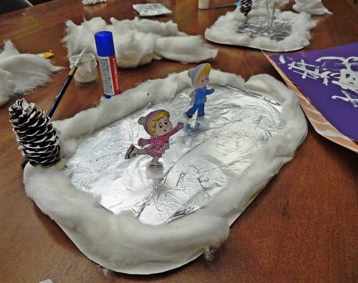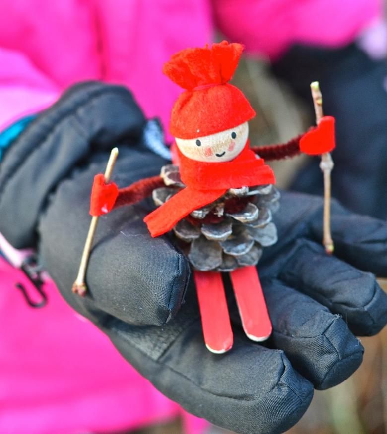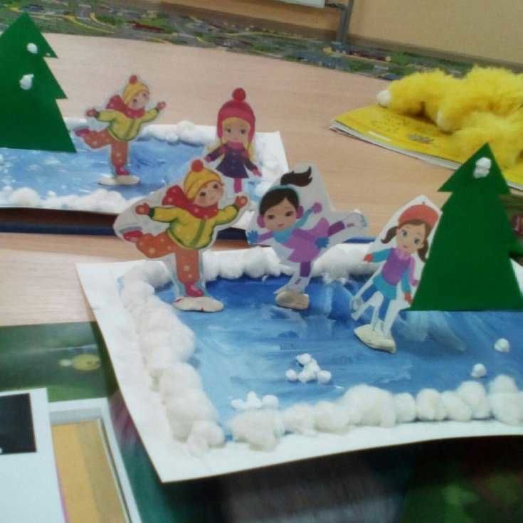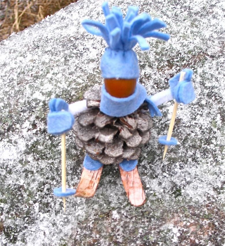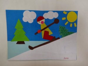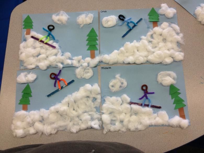 Зимните спортове са много разпространени и затова много деца ще изберат тези идеи за занаяти. Карането на ски е красиво занимание, а сега ще направим подобна илюстрация. Ще ни трябват: цветен картон, грис, три дебели конеца в различни цветове, лепило, пръчки и клонки от туя.