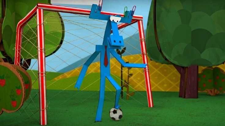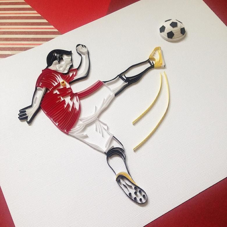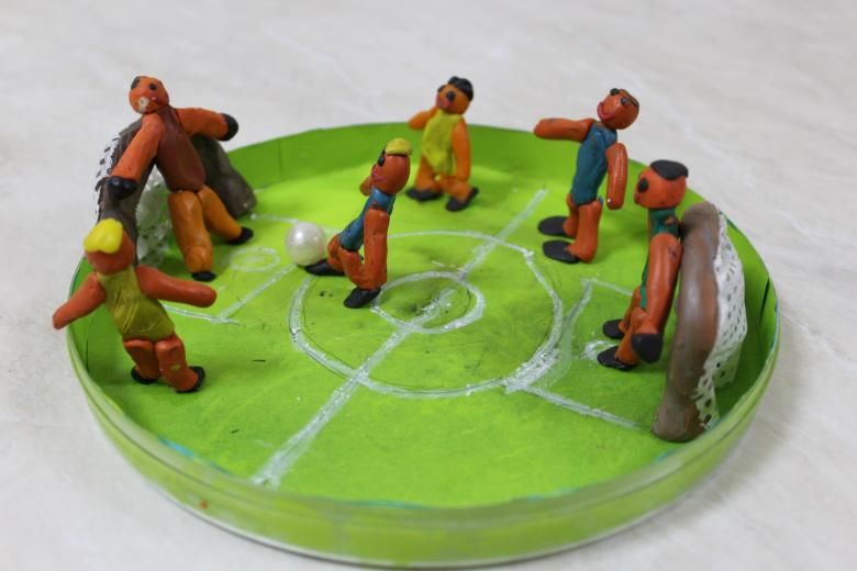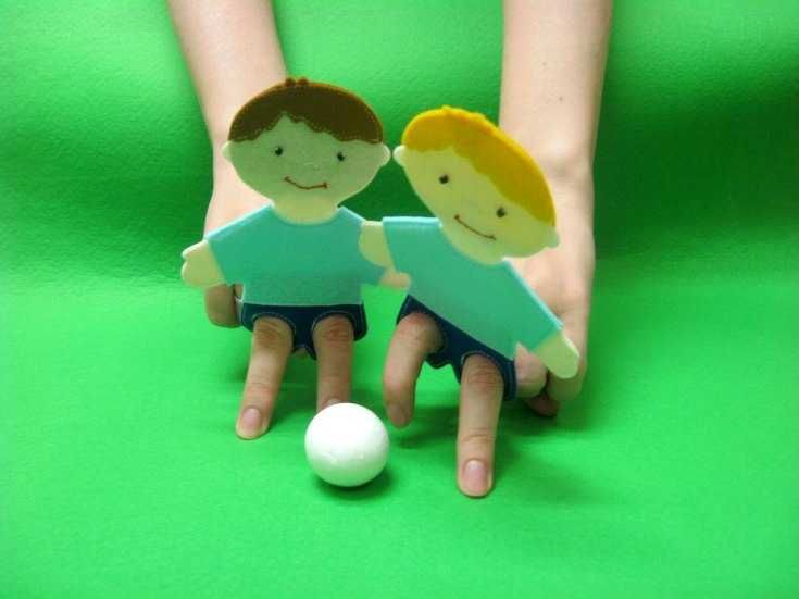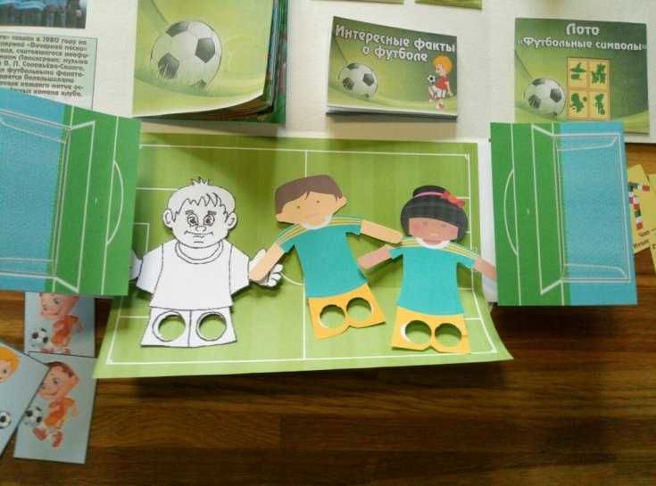 - Залепете всичко заедно. Изрежете от цветни листове солидни футболисти и хвърлете топката на терена.