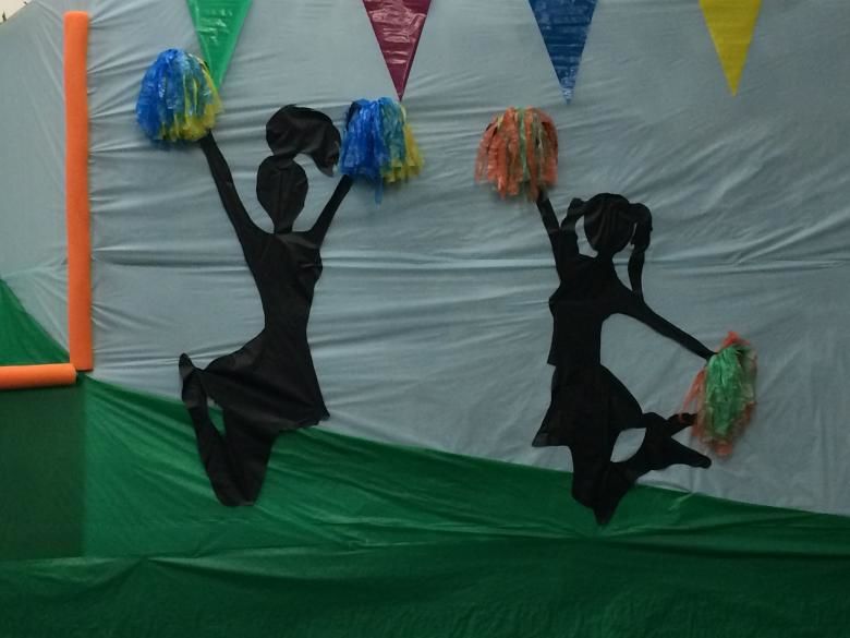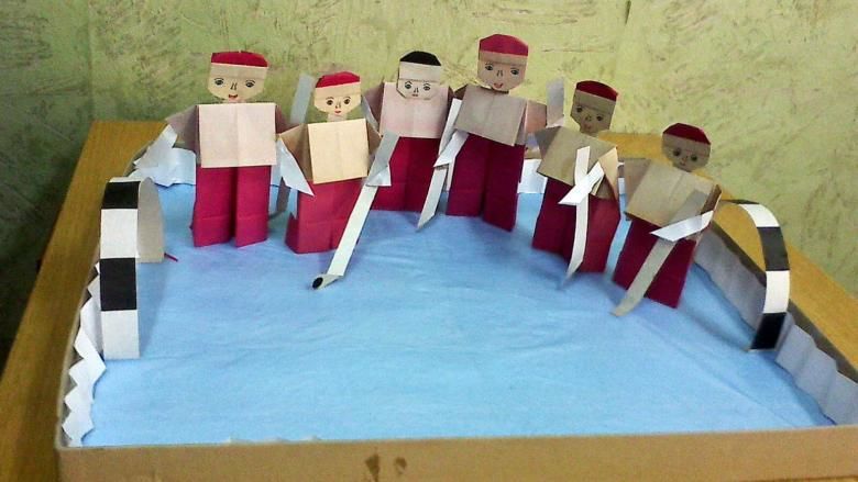 - Изрежете три кръга и шест пръчки от хартия с телесен цвят (ръцете и главите), а от други три цвята изрежете по един правоъгълник (торса). Изрежете три дълги ленти (по-дълги от дължината на басейна) и сглобете хората;