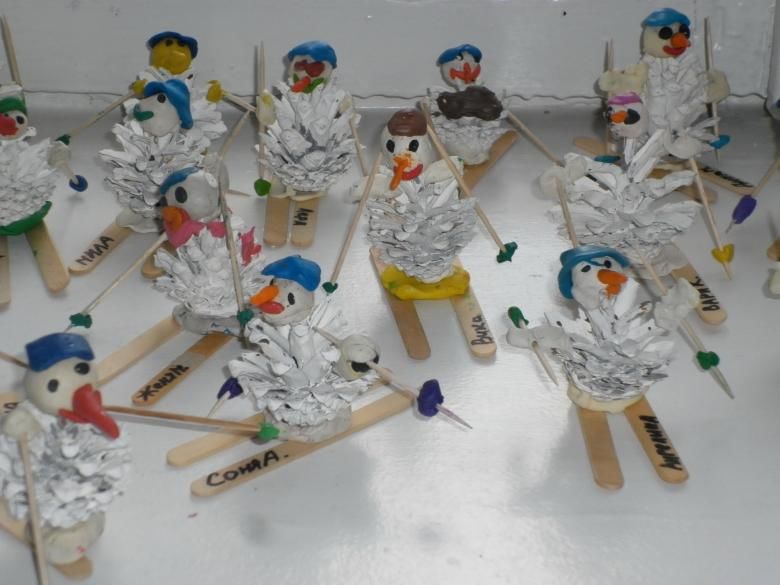 Един от най-лесните варианти е да използвате шишарки и жълъди. Не може да не си поемете дъх, когато ви хрумват много идеи. Но ние ще спрем работата със спортистите. Ще ни трябват: шишарки, жълъди, пластилин, пистолет за лепене и бижута по желание.
