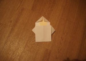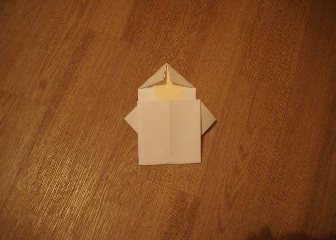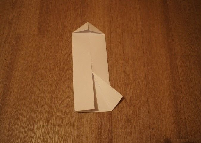 - Двете страни на листа се сгъват навътре към него. Най-горните ъгли са обърнати настрани. Долните ъгли също не са огънати.