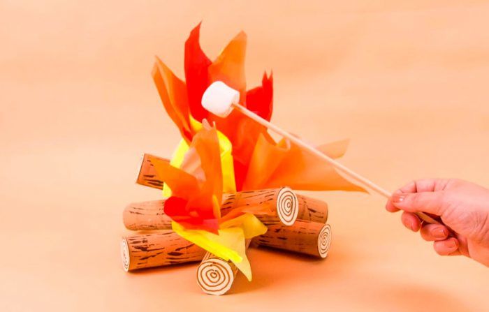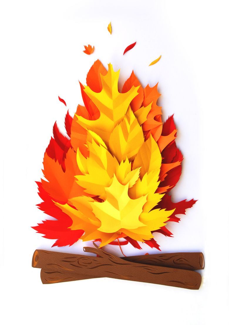 - Огънят е изрязан от хартия в червени и жълти нюанси.