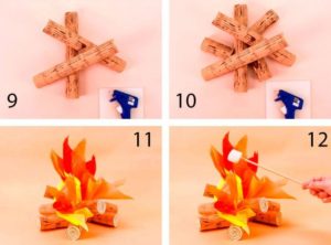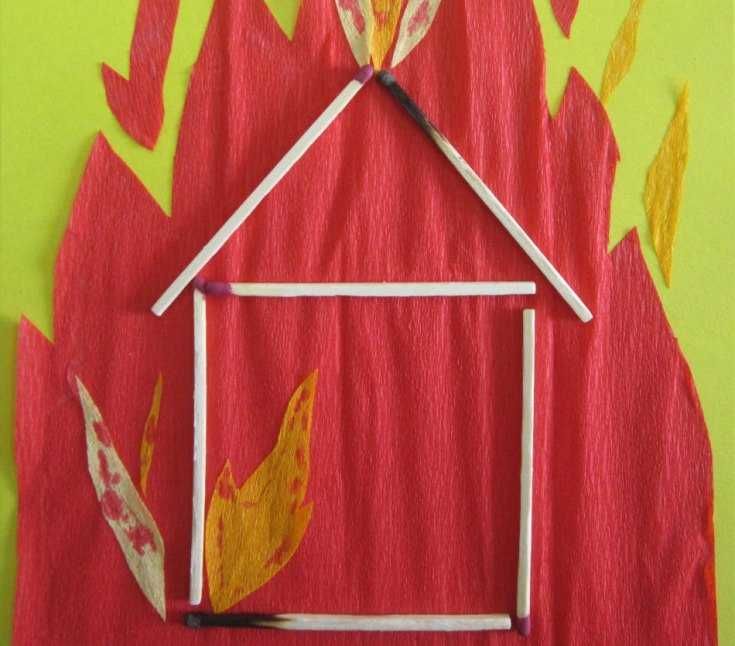 От запалките може да се направи модел на пожарна кола и изображение на горяща къща. Серовите глави трябва да се отстранят предварително, за да не изглежда материалът неуместен за занаят на тема огън.