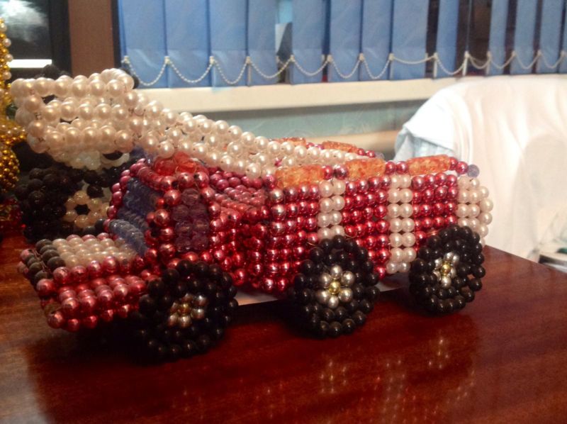 С мъниста могат да се правят зашеметяващи композиции. Върху картона е нарисуван контур на автомобил. С помощта на четка се поставят и залепват мъниста по контура. Когато контурът е завършен, мънистата могат да се поставят в модела.
