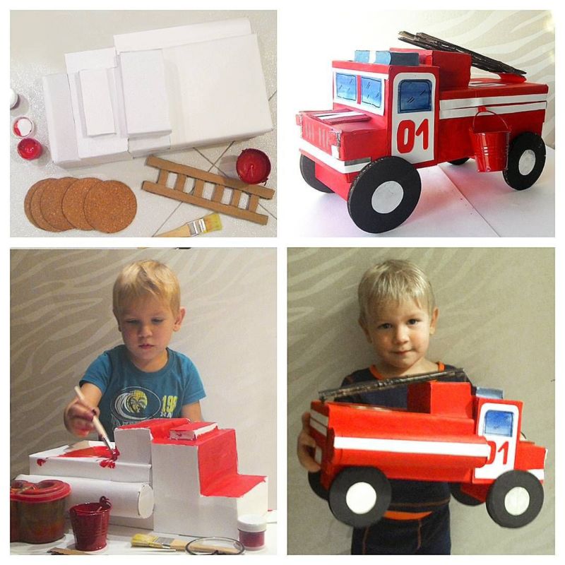 - От четири кутии, подредени по две, се прави пожарна кола.