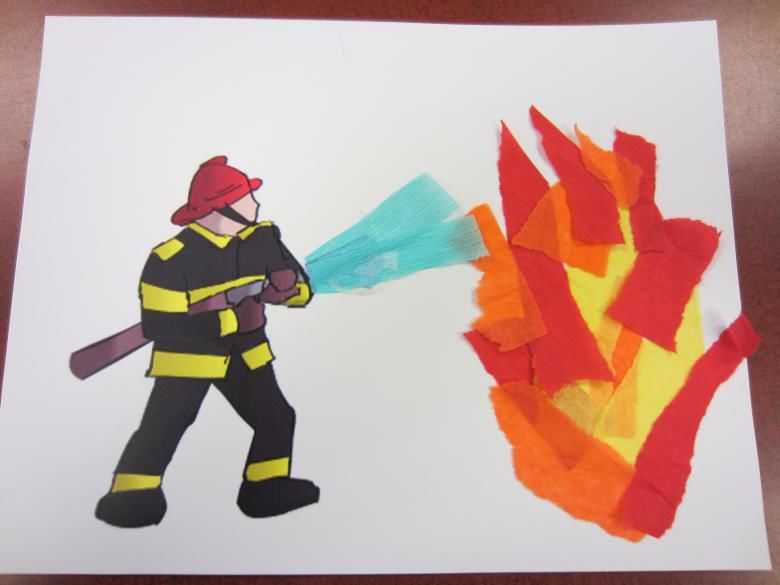 - Изрежете пламъци от картон и ги залепете за огъня. Можете да изрежете и фигурки на пожарникари.
