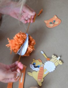 За целта ще ни трябват картон, един помпон, който ще играе ролята на грива, лента или въдица. По желание можете да украсите изделието с флумастери или бои: