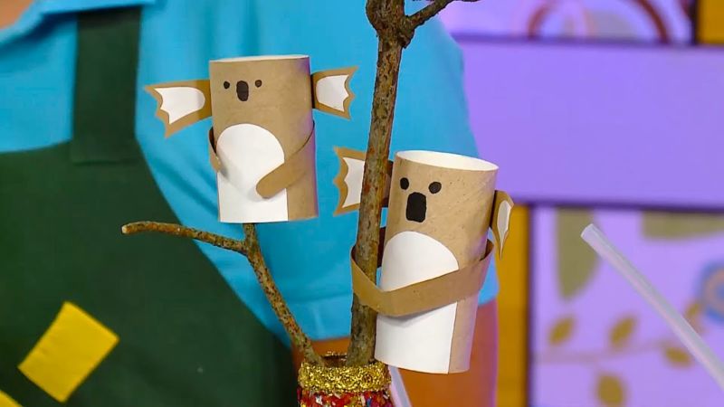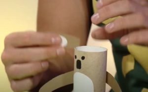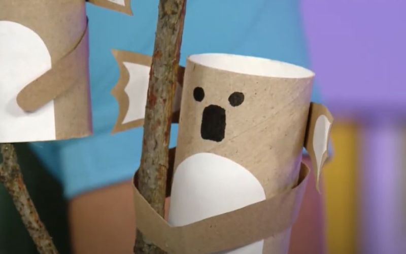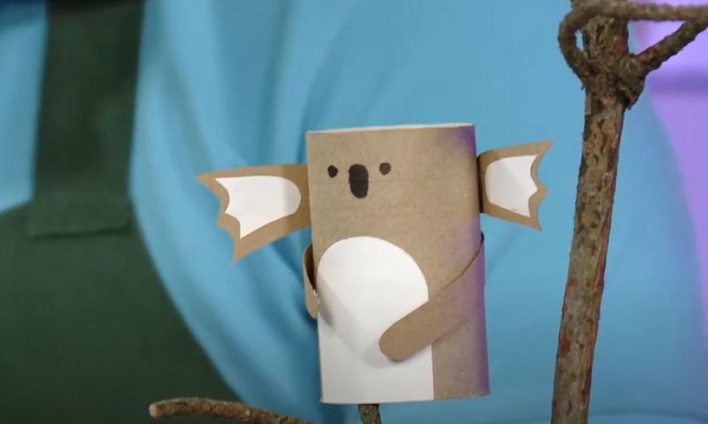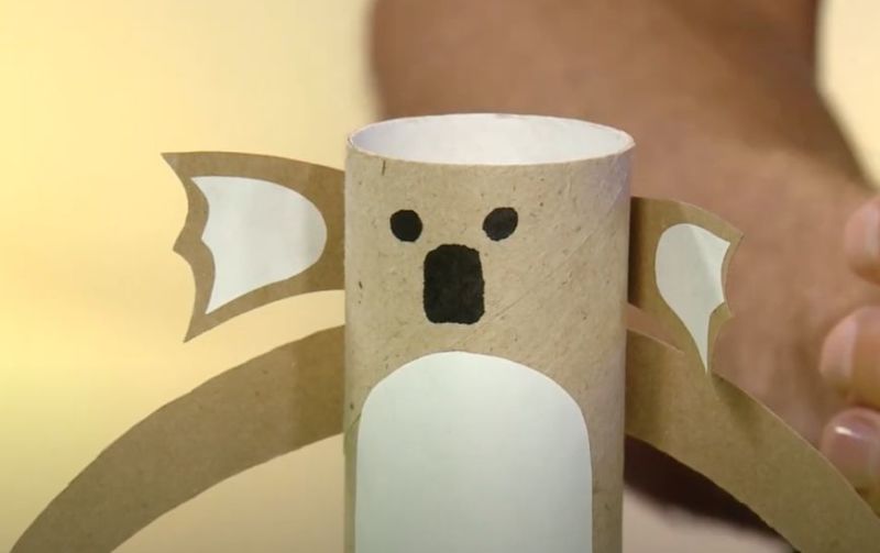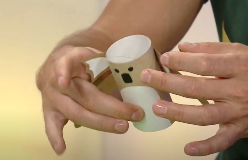 Нарисувайте лицето на коала върху картонения ръкав, като за образец са достатъчни книжки за оцветяване или снимки на животни. След това с помощта на нож за рязане на кашони изрежете лицето на коалата, изправете го и готово, за по-малко от 5 минути.