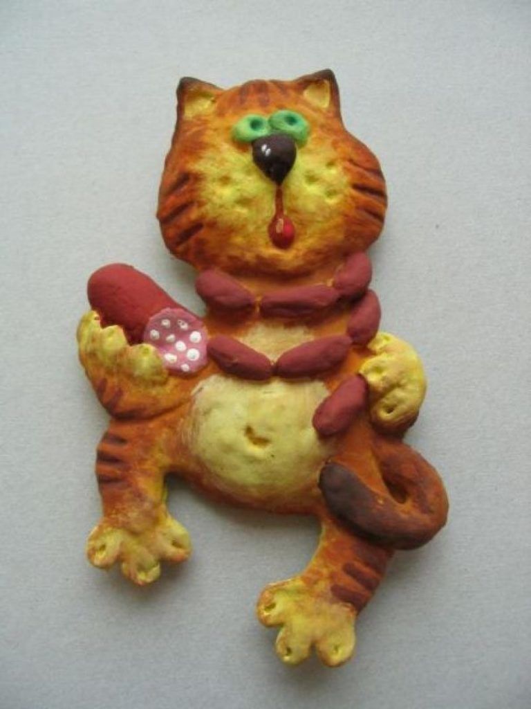 - Нещо повече, можете да направите произведение с подобен външен вид на вашия домашен любимец, тогава изработката ще бъде още по-интересна и оригинална! Техниката е съвсем проста и не се различава от работата с пластилин. Разточете тестото и го оформете във формички.