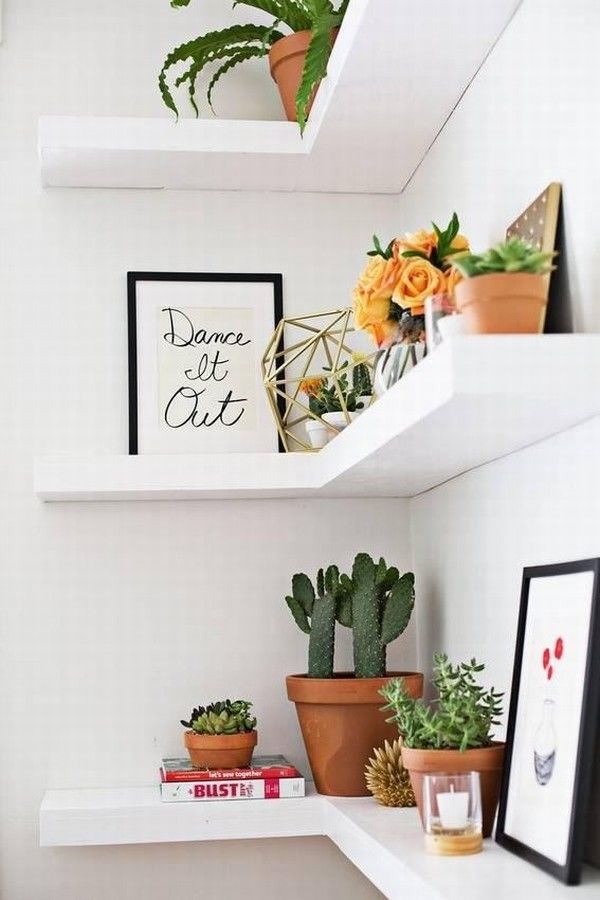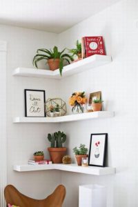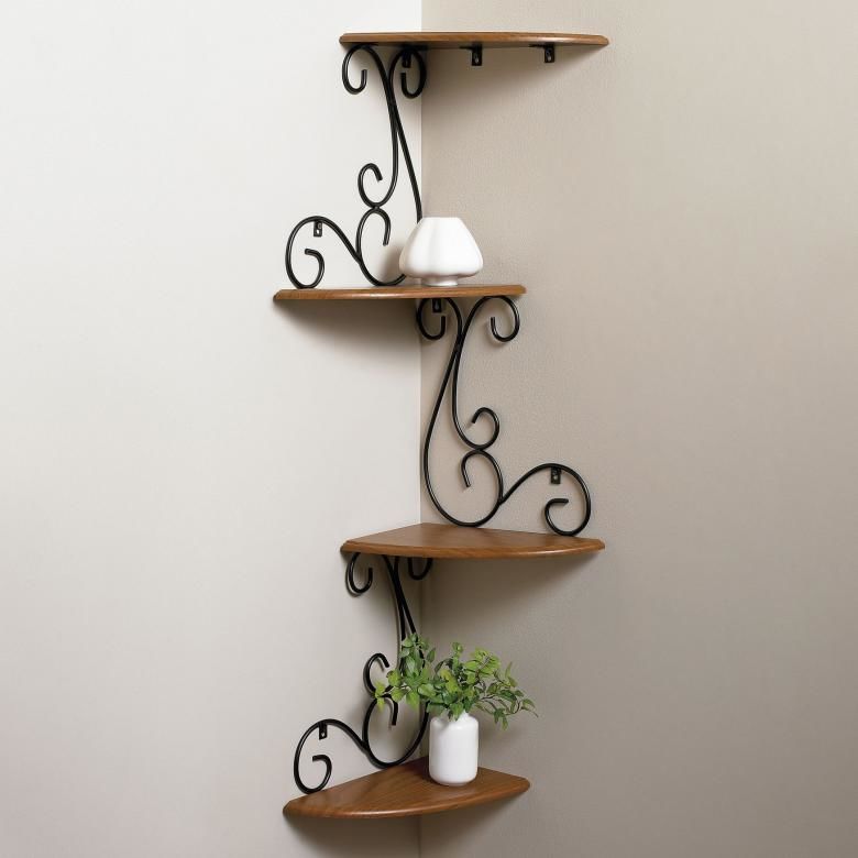 Спестете място с ъглов рафт. Те могат да бъдат подови или стенни и могат да бъдат разположени във вътрешни или външни ъгли. Предлагат се от различни материали.