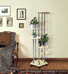 - Подови рафтове. Най-силните и здрави продукти, които са особено подходящи за големи растения в големи и тежки саксии. Те се предлагат в различни варианти - като стелажи, рафтове, единични стелажи, подпори, пирамиди, А-образни стелажи, стълби и др. Те изискват доста място за настаняване.