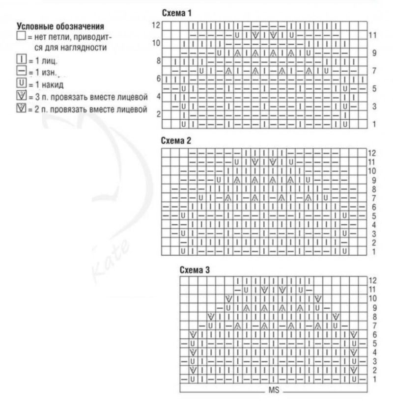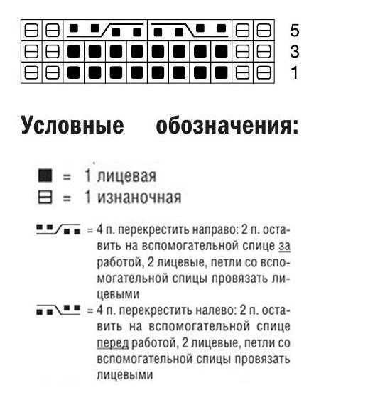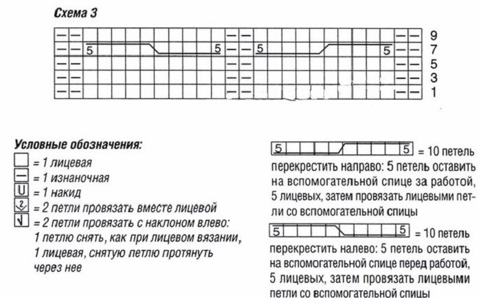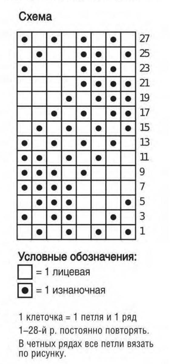 Вземете 82 бримки с метода "дълга опашка", плетете 6-7 см с ластик 3 върху 2. След това преминете към основния модел (повторете всеки рапорт 8 пъти):