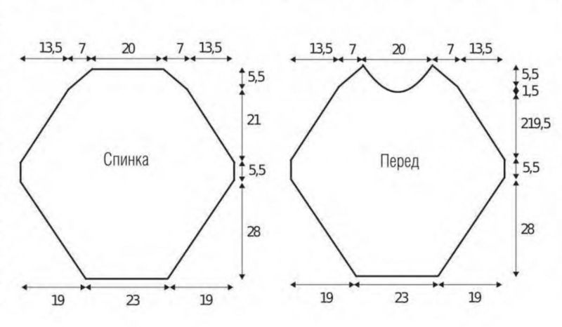 - За да украсите деколтето, изплетете един ред прави бримки, като добавите 6 бримки. Продължете с 24 см плетене на една кука в ритъм 2х2. Затворете шевовете.