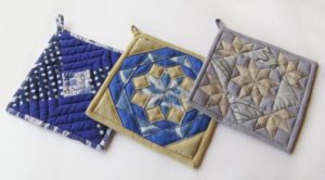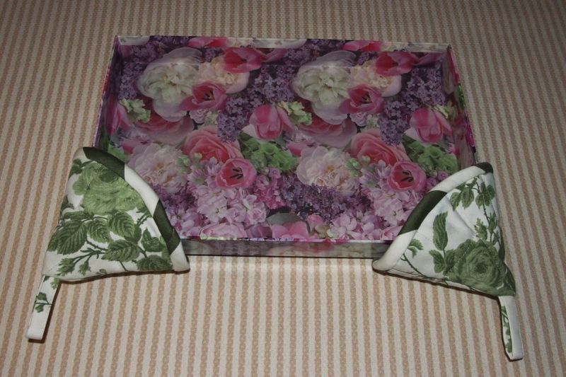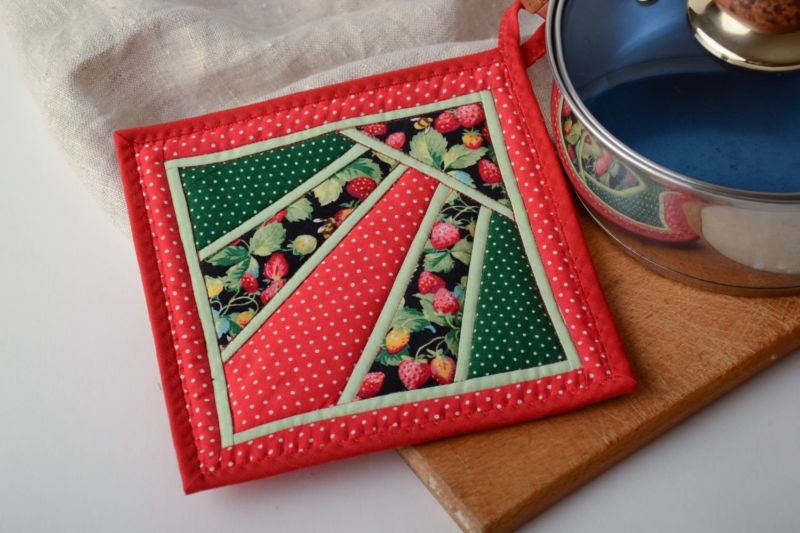 - Поставете плочата за захващане - прикрепете дръжката към ватираната основна част. Поставете отгоре парче от основния плат със същия размер. Обърнете изделието по трите му края.