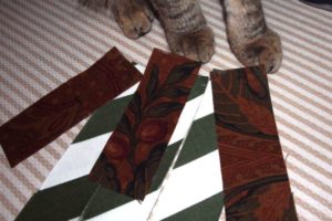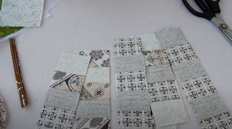 - От декоративния плат пригответе 4 ленти с размери 6x17 и 2 за дръжките с размери 6x20 cm.